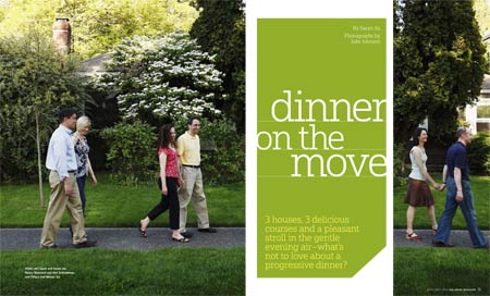 Two springs ago, I planned a progressive dinner (remember those?) with neighbors, which was photographed for a feature I wrote for Hallmark magazine (sniffle, sniffle–the magazine folded last year, just before this story was to be published!). My editor was kind enough to send me some of the photos, taken by the super-talented Jake Johnson of Hallmark, and I wanted to post a little snippet of that day here. (I’m still drooling over that food–I developed the recipes for all, but on the day of, we had a chef do the cooking–whew! It’s a tough job being a “model”!)