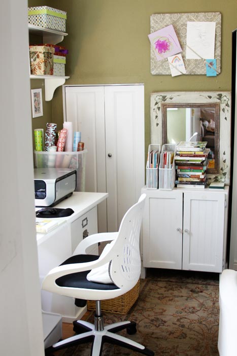 My office is a thoroughfare in this house. It has two doors, so the kids ride their trucks in and out, and leave a path of toys and messiness in the their wake. It connects to the family room, so I can sneak off to write an email or work on a blog post (like now!) while they play or watch Sesame Street in the mornings.