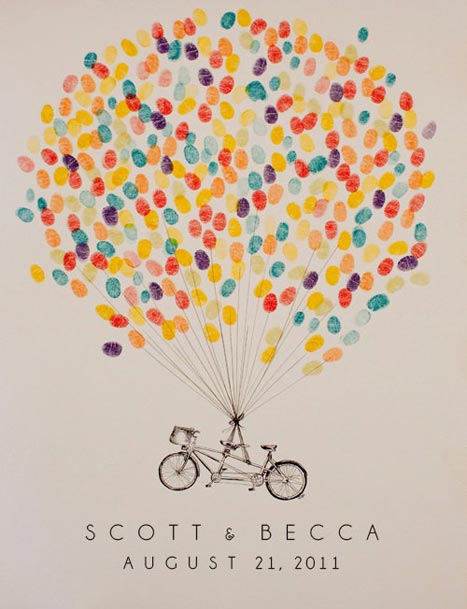 How cool is this idea for a unique wedding “guest book”, from Etsy? Though we had a traditional guest book at our wedding, I don’t think I’ve looked at it in the entire 10 years we’ve been married. (And, um, I don’t even know where it is!) I love the idea of having guests stamp their thumbprints in different colored ink on a beautiful print like this—though, I’m not sure if you’d want to keep it out after the cocktail hour, because it would look a little smudgey! But maybe that’s part of the fun?