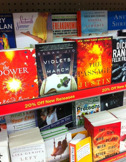 My friend Audrey (who’s an amazing yogini, writer and child wrangler) lives in Vancouver, Canada, and she sent me this photo of The Violets of March at London Drugs, which, for the U.S. readers here, I understand is sort of like Walgreens or Longs Drugs. Anyway, I think London Drugs sounds exceedingly fancier than any U.S.-based drug store, don’t you think? It sounds like the place Kate Middleton would go to pick up toothpaste and shower gel! Ooh, la la!