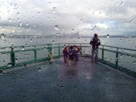 Denise took this breathtaking photo, below, on the ferry ride back to Seattle. Don’t you love how the rain looks?