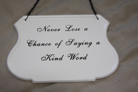 I saw this plaque hanging in an antique store recently, and though I thought it was a lovely saying, I walked on. But as I continued through the store, the words haunted me. How many times have I considered paying someone a compliment, or stopping a stranger on the street or in a restaurant to say something nice or encouraging, but chose not to because I was too busy, tired, late, grumpy, fill-in-the-blank? Sadly, too many times. So I turned around and bought the plaque, and it’s now hanging in my office.